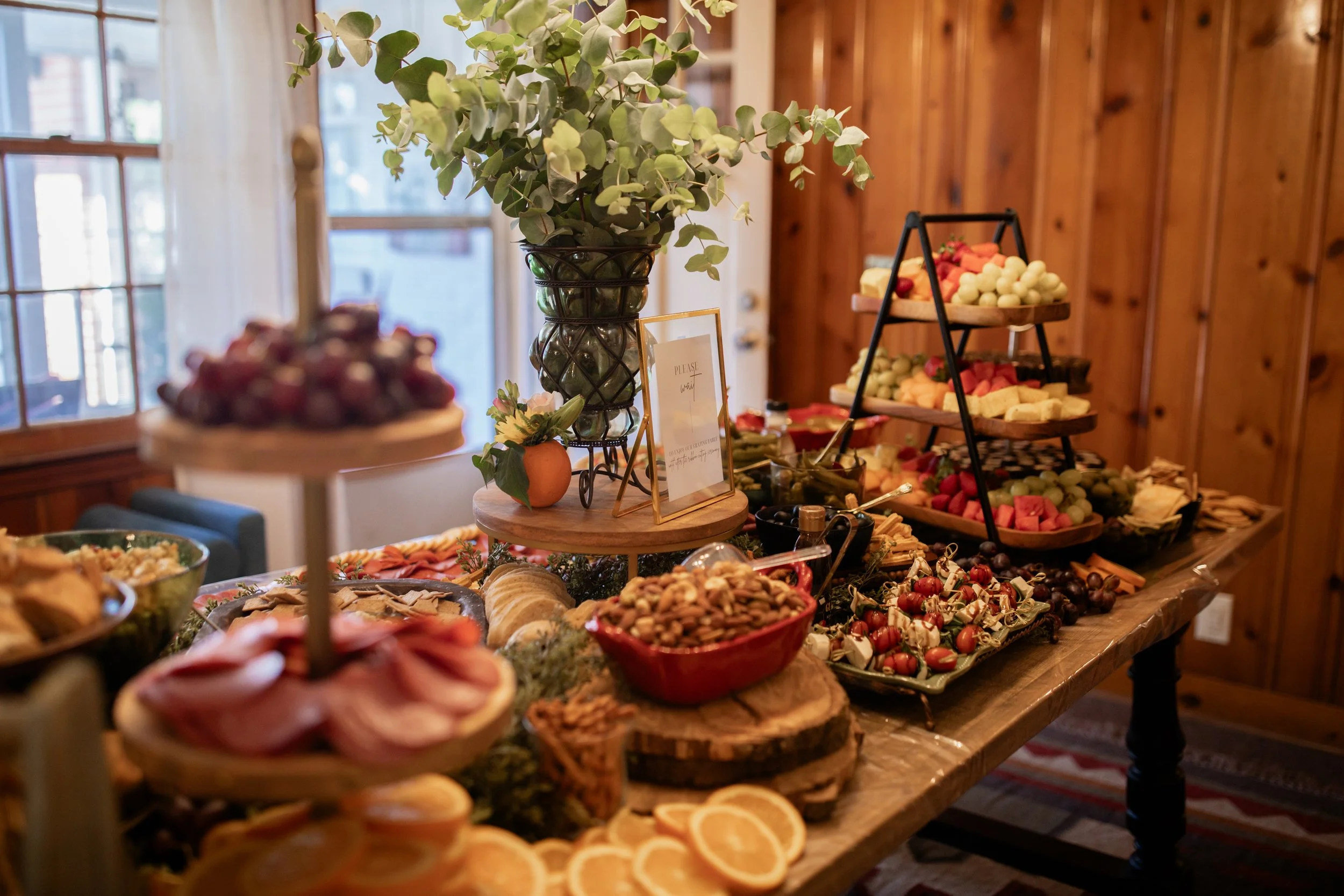 Buffet table with assorted appetizers, including a tiered stand of fruits and vegetables, sliced meats, nuts, crackers, and a vase of greenery, set in a rustic room with wooden walls.